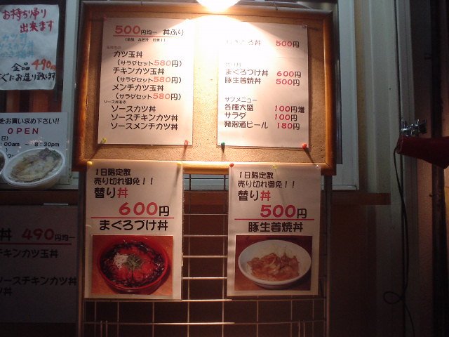 基本的にどんぶりものは500円均一で、かつ玉丼、チキンカツ玉丼、メンチカツ丼、ソースカツ丼、ソースチキンカツ丼、ソースメンチカツ丼があります。ねぎとろ丼、かき揚げ丼もあるようです。どんぶりものにはお味噌汁が付きます。他にも1日限定数で替り丼というものがあり、この日はまぐろづけ丼と豚生姜焼き丼というものがありました。売り切れ御免なので遅い時間だとないかもしれません。